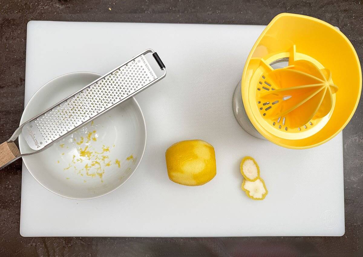Using a cutting board, cut off the ends of the lemon. This makes it easier to zest the lemon. Start by zesting the lemon, then cut it in half and juice both halves. Set both of them aside.