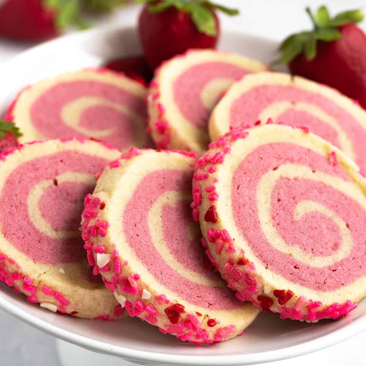 Soft and tender sugar cookies made with vanilla and strawberry dough rolled together for a classic pinwheel swirl. These cookies are lightly sweet, easy to slice, and perfect for Valentine's Day or any time you want a pretty, bakery-style cookie.